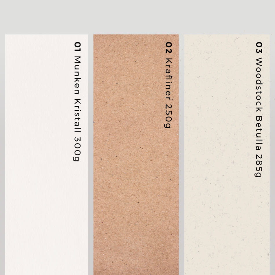 wykonywane są z papieru ekologicznego, standardowego papieru gładkiego w odcieniach: biały, kraft i oraz kremowym o gramaturach 250-285g.